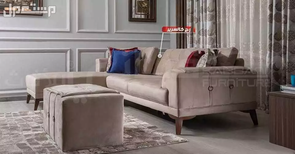 ركنة فاليريا لون بيج - بظهر متحرك ( ميكانزم) 300×200 سم + بف + 6 كوشن خشب زان و قماش معالج ضد الاتساخ