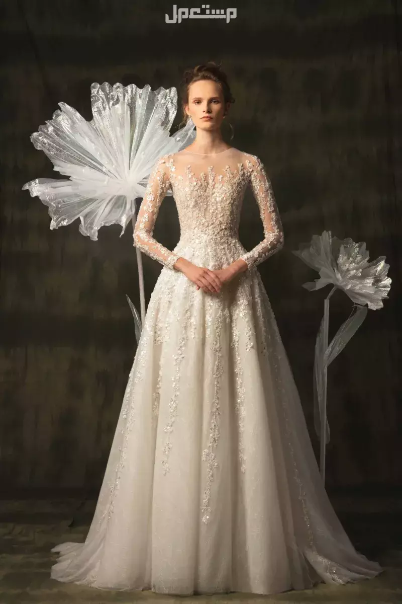 • أكمام دانتيل شفافة: تضاف لمسة من الأناقة والأنوثة، مما يجعل العروس تبدو رقيقة وفاخرة.