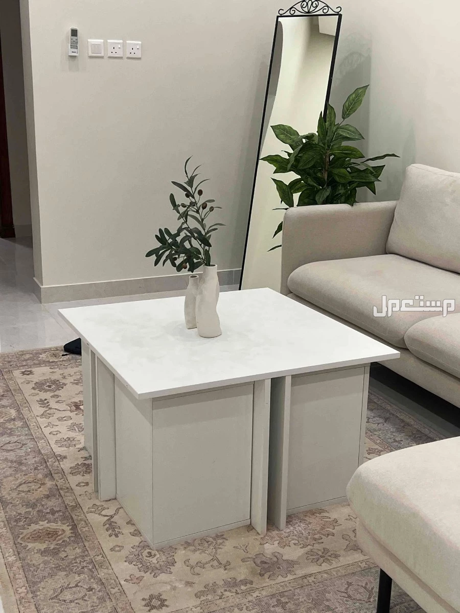 للبيع طاولة قهوة (سنتر) بتصميم عصري وعملي جداً، تتميز بوجود 4 طاولات خدمة مخفية بداخلها تقدر تطلعها وقت الحاجة وتوفر عليك مساحة الصالة.