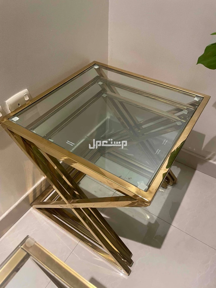 طاولة للصالة و طاولتين جانبية و ثلاث طاولات خدمة في الدمام بسعر 1500 ريال سعودي تم شراها من مفروشات الرقيب (اشلي) اللون ذهبي و زجاج
