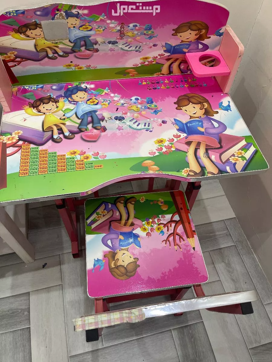 طاولتين مكتبية أطفال مع الكراسي اللون وردي مع رسومات على سطح المكتب ملاحظة واحد من الكراسي مكسور السعر 70 ريال