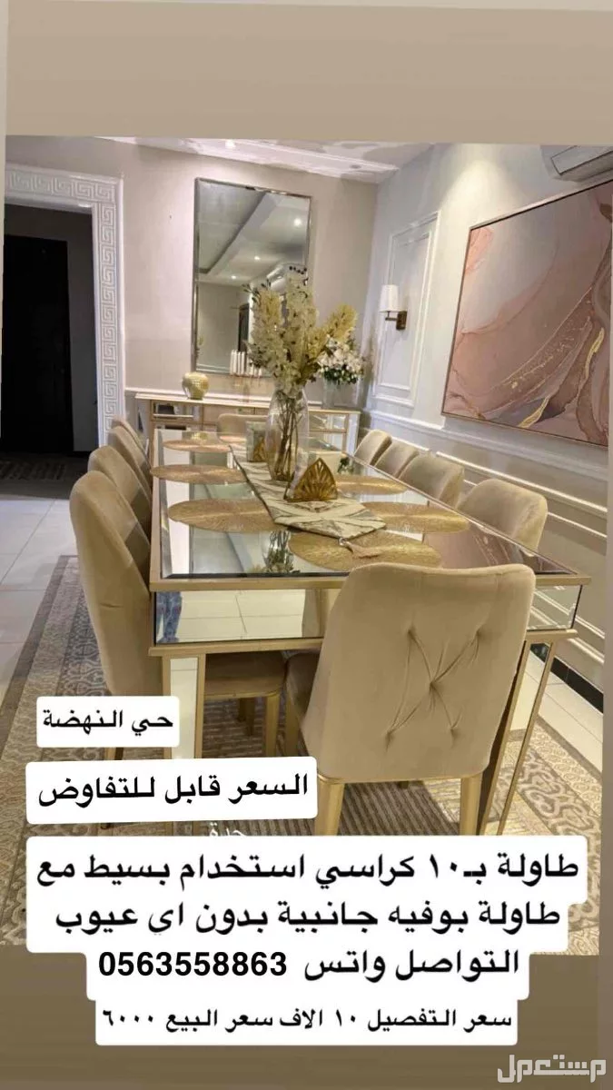 طاولة طعام نظيفة بدون اي عيوب عدد 10 كراسي + دولاب بوفيه سفرة+مرايه +تلبيسة حماية للكراسي كلفتني 10500 البيع ب 5000 وقابل للتفاوض التواصل واتس