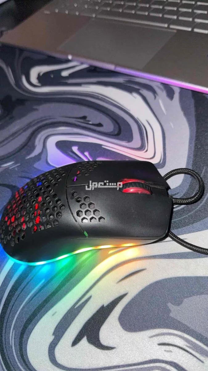 • إضاءة خلفية RGB: إضاءة مذهلة بألوان قابلة للتخصيص لإضافة لمسة جمالية لمنطقة العمل أو اللعب. (تظهر الإضاءة في الصورة بألوان متدرجة). ماوس ألعاب سلكي يتميز بتصميم خلية النحل الخفيف جدًا، مناسب للألعاب السريعة مثل الـ FPS.
