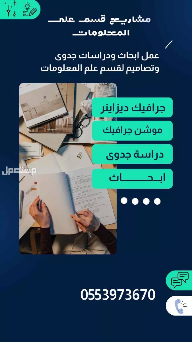 جميع الاعمال المكتبيه والبحوث الدراسيه نقوم بإعدادها وتصاميم الافراح واللوجوهات والبزنس كارد والمنيوهات وفديوهات الموشن جرافيك