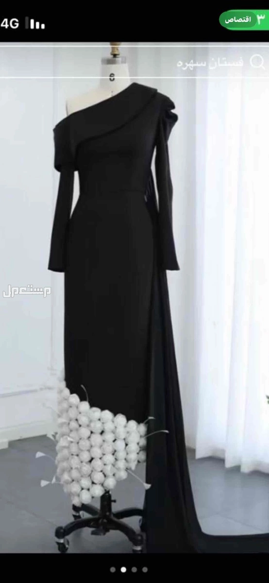 الأسود بأكمام طويله وطويل ويوجد به ريش و ورد الفستان الاوف وايت من مصمم كويتي تطريز بالؤلؤ علاقي تلبس مقاس M