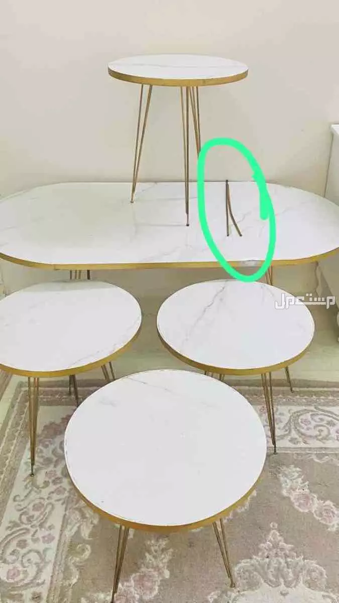 طقم خمس طاولات بيضاء للبيع نظيفة سبب البيع وحدة من قاعدة الطاولة الكبيرة انكسرت ويبغالها تلحيم موجودة القاعدة بس تتلحم
