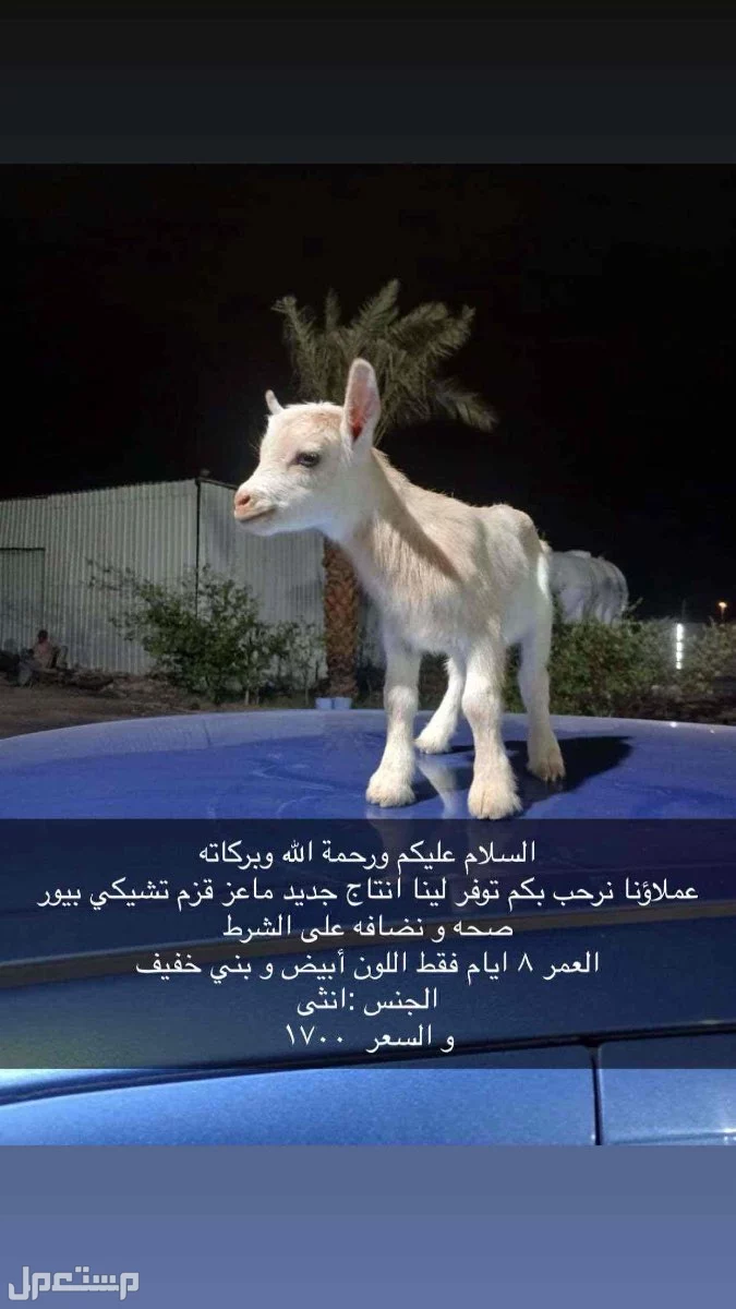 سلام عليكم نوع الحيوان ماعز قزم تشكي بيور الجنس أنثى العمر ثمانية أيام صحة ونظافة على الشرط اللون أبيض و بيج خفيف يوجد توصيل لجميع المناطق المملكة على حساب المشتري نتشرف فيكم انشر إعلانك