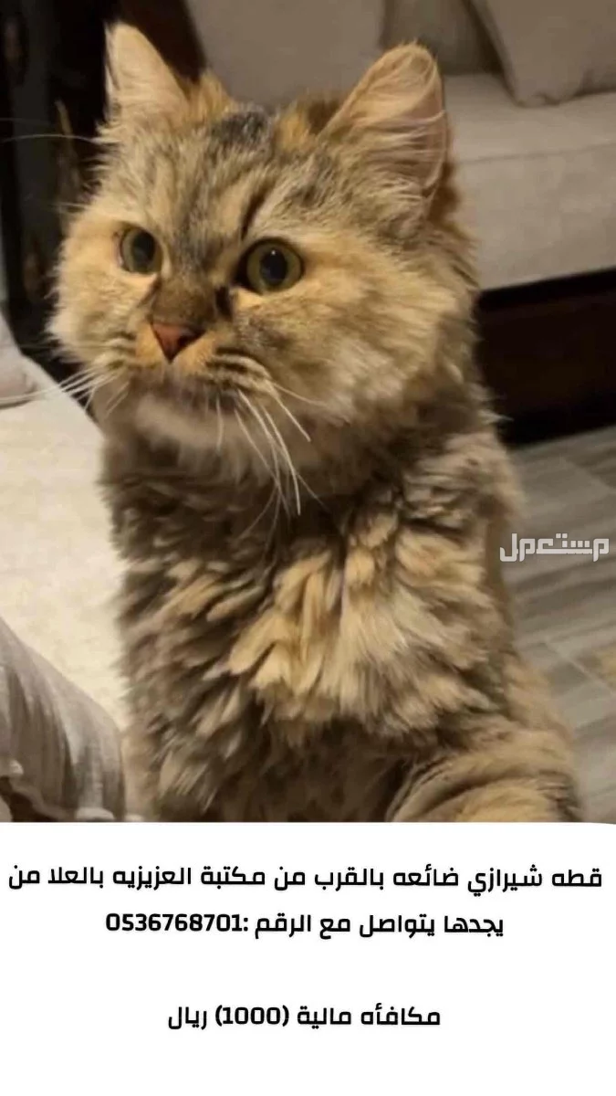 قطه شيرازي ضائعه بالقرب من مكتبة العزيزيه بالعلا من يجدها يتواصل مع الرقم : مكافأه مالية (1000) لمن يجدها