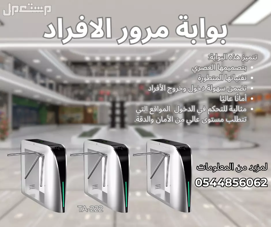بوابات امنية لمرور الافراد والموظفين ثلاثية برمجة وتركيب بوابات دخول الافراد للتحكم في الدخول والخروج تصل للنوادي الرياضية والشركات والمؤسسات الصغيرة والمتوسطة هي بوابات للتحكم في دخول الافراد للمنشأه , تقوم على تامين المنشأه من دخول الافراد الغرباء والذين لاتمسح بدخولهم لديك , تسمح بدخول الاشخاص بشكل منفرد فقط يمكن لشخص واحد بالمرور من خلالها فى كل مره يمكن ان تعمل بالبصمة او بالكارت او من خلال التعرف على الوجه او من خلال الرقم السري ويمكن ان تعمل من خلال ال QR وقرائته من على الجوال