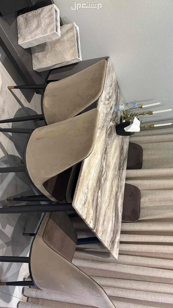 طاولة طعام مع ست كراسي بقماش شمواه ، سطح الطاولة درجات البني والعسلي والكراسي لون بني وارجل لون اسود بذهبي استخدام نظيف لا يوجد اي خدوش