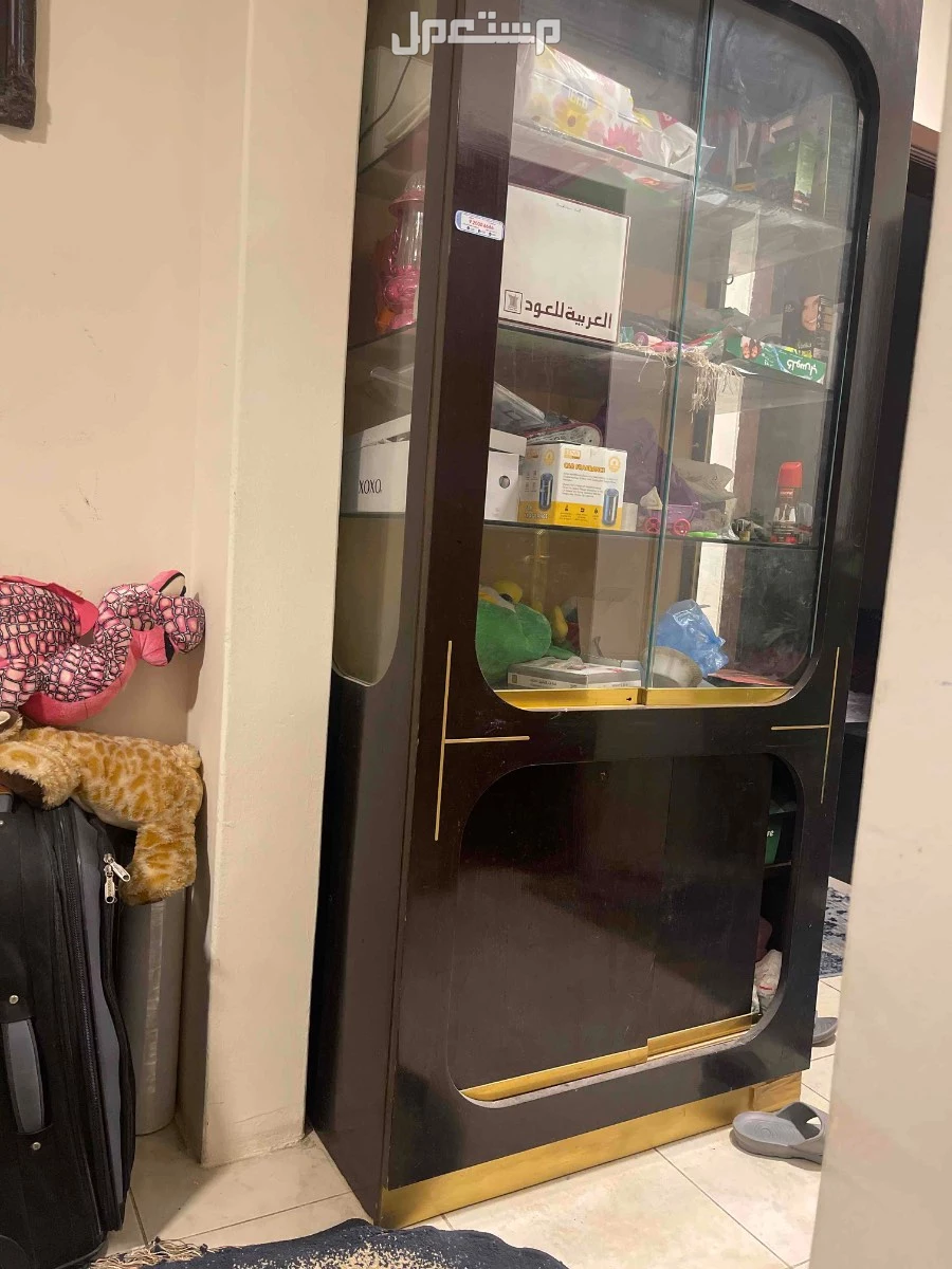 غرفة سفرة كاملة لون بني غامق تتكون من عدد 1 طاولة خشبية بقرص زجاجي + عدد 6 كراسي خشبية + عدد 1 نيش خشبي بأبواب زجاجية