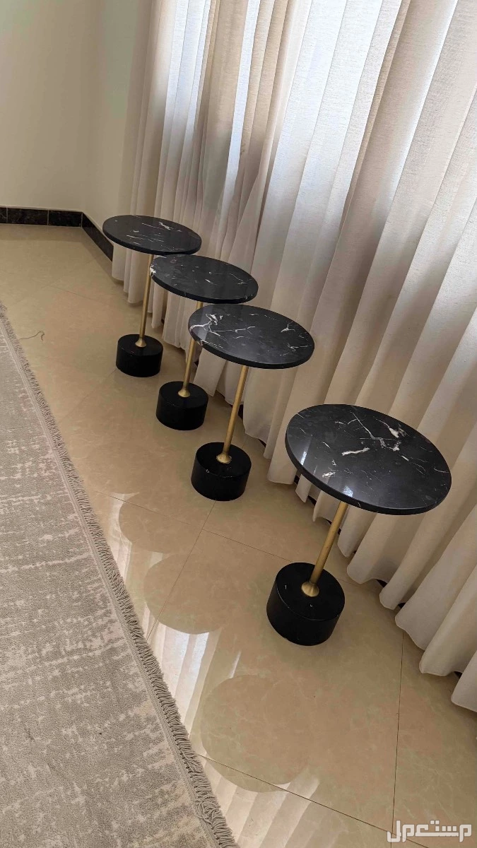 للبيع طاولات مكونة من واحده كبيرة مستطيلة و1 جانبية و4 طاولات على خدمة على سكل دائري مينوعة من الزجاج وورخام باللون الاسود بسعر 300 ريال