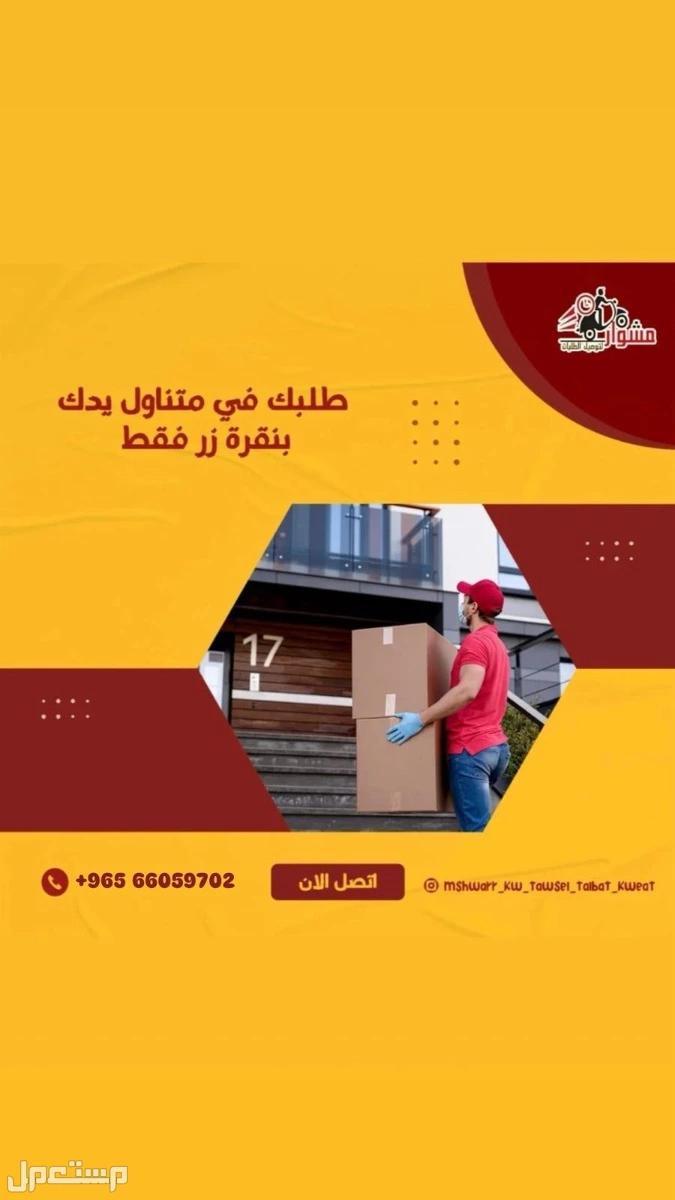 تقدم شركة مشوار لتوصيل الطلبات الاستهلاكية في الكويت خدمة توصيل على مدار 24 ساعة. الاتصال عبر واتساب فقط: 97823404.