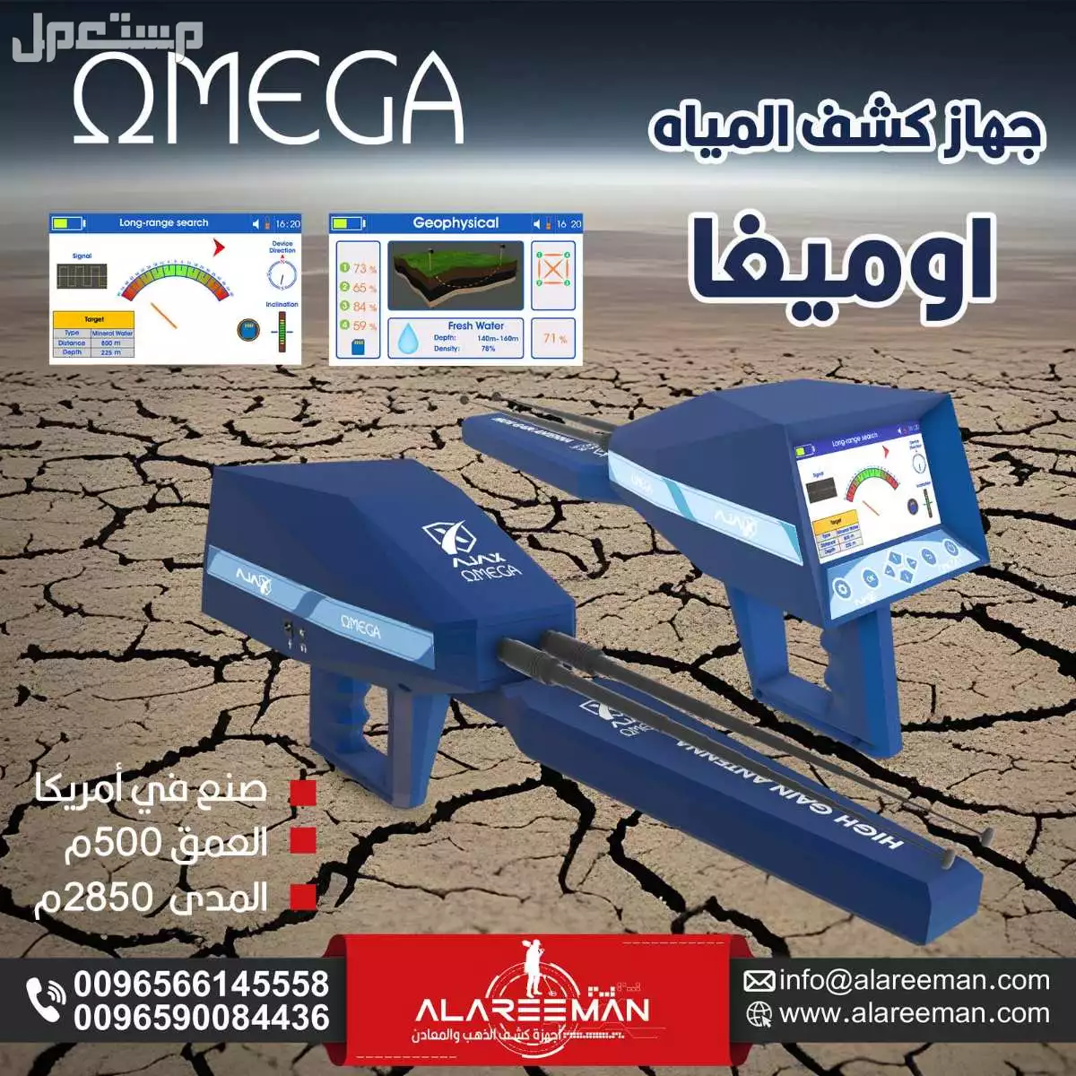 OMEGA هو جهاز الكشف الاستشعاري عن بعد والأول عالمياً للكشف عن المياه الجوفية وتحديد مواقعها. إذا كنت مزارعاً أو إذا كنت تعمل في حفر الآبار، فإن جهاز أوميغا يعطيك الحل الأمثل للقضاء على مشاكل شح المياه ومشاكل الحفر العشوائي وذلك بحثاً عن مكانها، والذي يوفر مالك ووقتك وكثير من العناء والتعب.