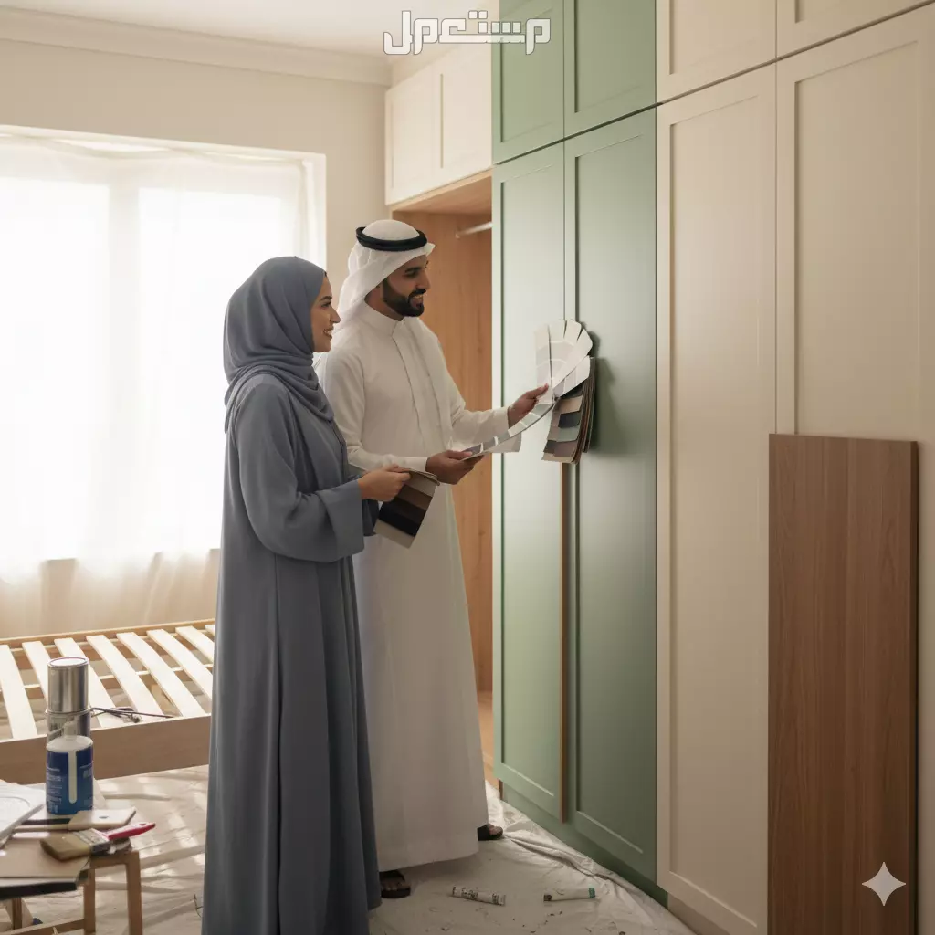 يمكنك اختيار لون خزائن غرف نوم من نفس عائلة لون الجدران بدرجة أغمق أو أفتح، أو اختيار لون متباين تماماً لخلق تباين جذاب، القاعدة الذهبية: إذا كانت الجدران فاتحة، يمكنك اختيار خزائن فاتحة أو داكنة، لكن إذا كانت الجدران داكنة، اختر خزائن فاتحة لتوازن الغرفة.