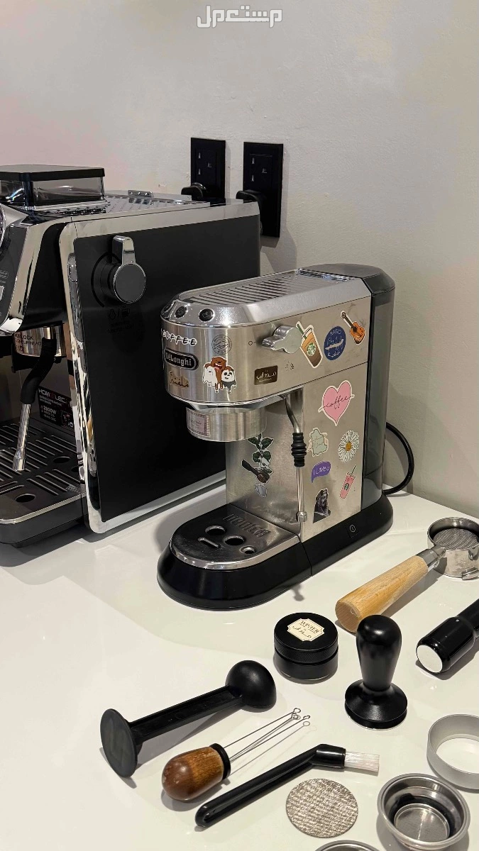 ملحقات الاله : 3 بورتفلتر واحد الاساسي اللي مع الاله واثنين مكشوف ( الخشبي مجاني لانه متقشر ) + تامبر وموزع وحلقه وقطعه الاستخلاص + مفكك تكتلات + 2 باسكت + فرشاة تنظيف ومحلول تنظيف