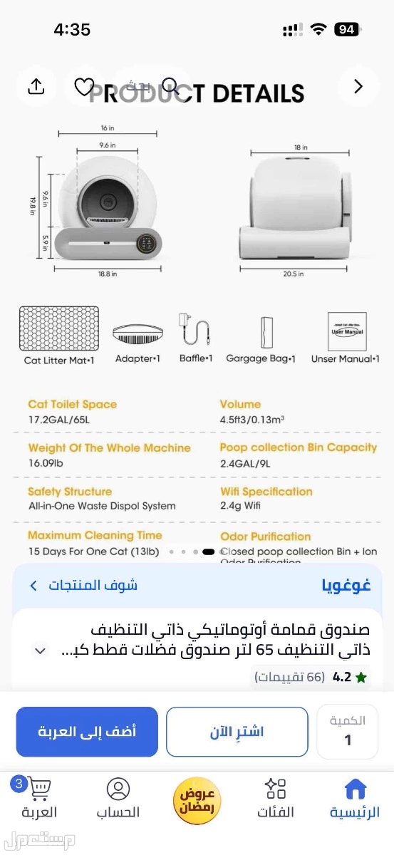 لتر بوكس ذكي مع تنظيف ذاتي و تطبيق فالجوال للتحكم عن بعد + ومعطر السعر عند الشراء 1500 سعر البيع 750 جديد تم استخدامه لشهرين وتوفت القطه