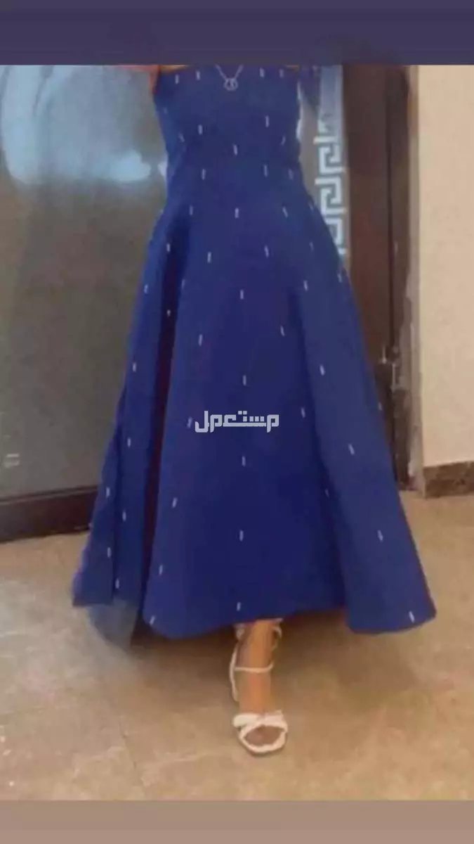 فستان سهرة راقي بلون أزرق ملكي، قصة A-Line واسعة ومريحة بالحركة. تصميم بدون أكمام، بنقاط لمعة موزعة على كامل الفستان تعطي لمسة ناعمة وراقية. استخدام مرة وحدة فقط – نظيف جداً وما فيه أي تلف أو عيب