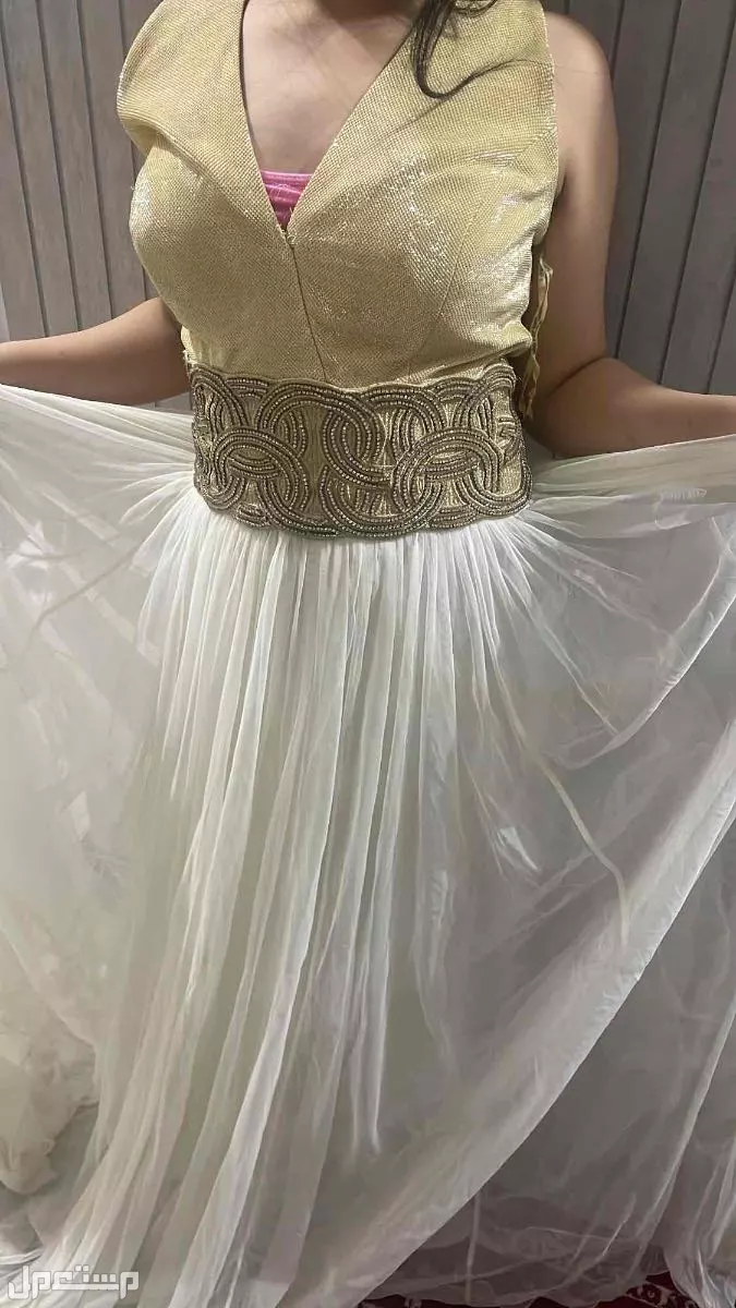 ✨ فستان أبيض وذهبي فاخر للسهرات ✨ تصميم راقي يبرز الأناقة والجمال مقاس ميديم | مستعمل ثلاث مرات فقط 💰 فرصة لاقتناء فستان مميز بسعر مناسب 🔥 قابل للتفاوض المعقول