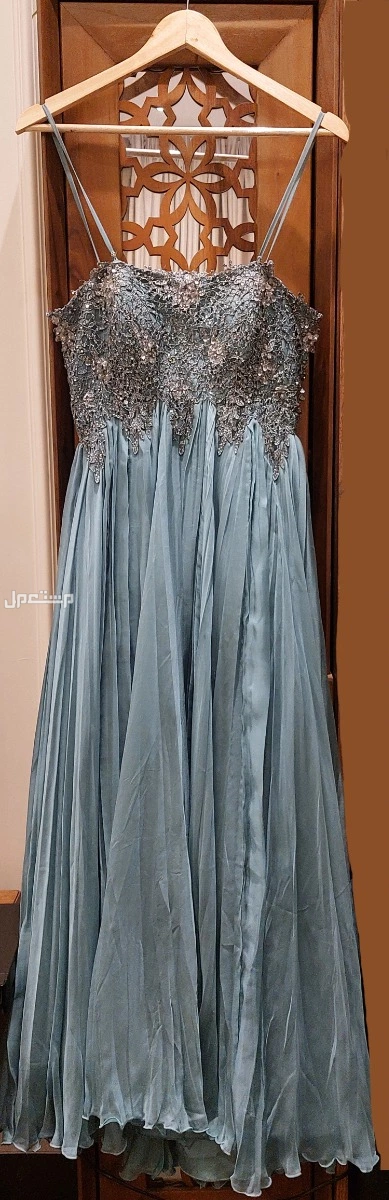 مقاس: S اللون: فستقي (تيفاني) الخامة: شيفون حرير مع جبير مطرز بخرز وكريستال في الصدر بفضي الطول: يلبس شخص طوله 150 إلى 160 الاستعمال:مرة وحدة استعمال نظيف