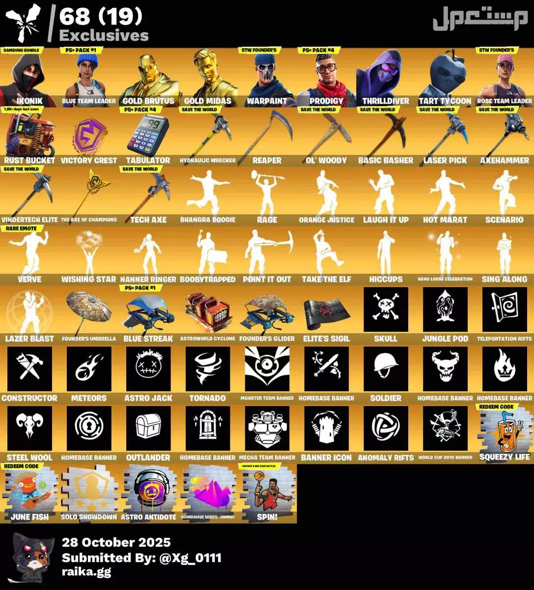 للبيع حساب فورت نايت سكنات منها المحظوره و الرقصات مشاهير و ابيك و غير ملصقات الحصريه و طور زومبي قديم فيبوك لانهائي للتواص خاص او واتس