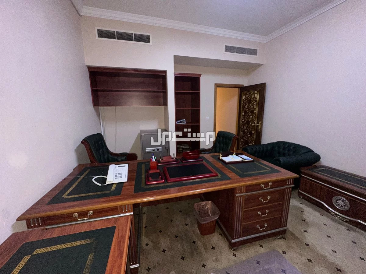 مكتب كلاسيك بسطح خشبي مع ادرج جانبية للتخزين وطاولة مستطيله وعدد 3 كراسي دوار وعدد 2 كنب يتميز بزخرفته الفاخرة ويضيف لمسة من الفخامة الى مكان العمل