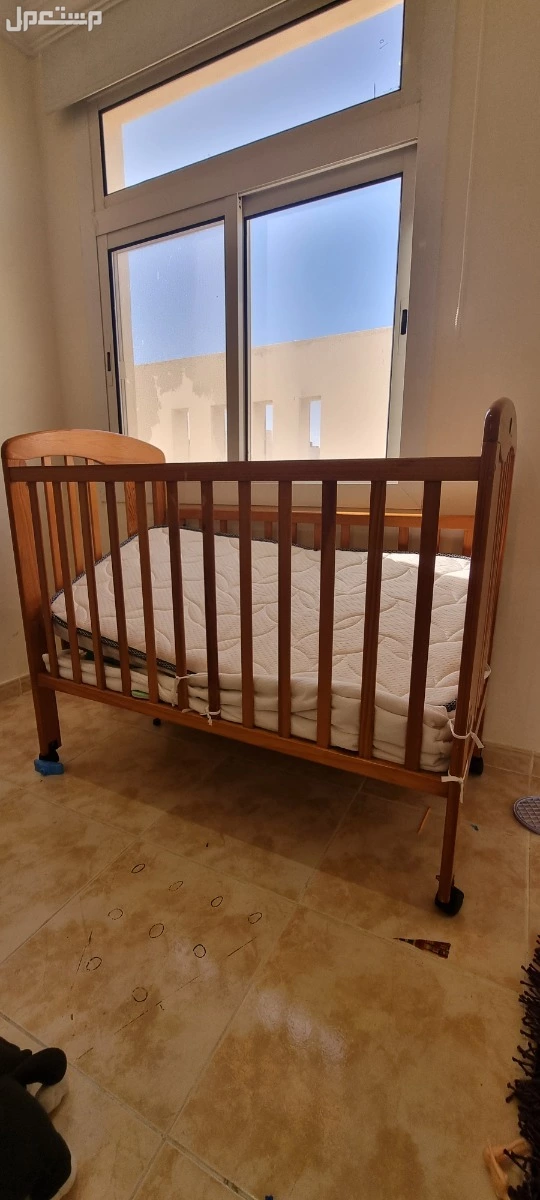 سرير اطفال مع مرتبه باللون الخشبي قابل لتغيير مستوى السرير لعدة مستويات طرف الحاجز متحرك لسهولة الوصول للطفل بحاله ممتازة