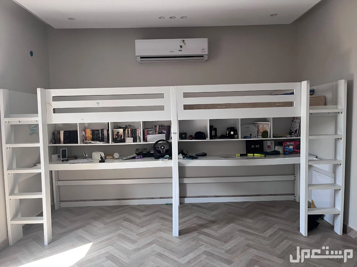 سريرين منفصلة مكونة من ممتب بأرفف تحت ودرج وسرير علوي ، واحد فيهم موضح صورة العيب فيي مكسور من فوق كسر بسيط ومغرا