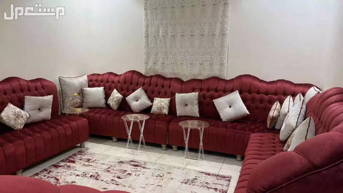 كنب مجلس راقي فخم تصميم ملكي عدد 6 قطع (5 طويلة + كورنر) قماش مخمل لون عنابي الخشب ممتاز جدًا + سجادة وستارة مستعمل نظيف السعر 1200 قابل للتفاوض