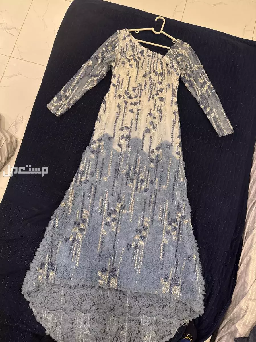 فستان لون بيبي بلو (سماوي ) استخدام مره واحده تقريبا جديد اشتريته 900 ريال الموديل له ذيل من الخلف المقاسات الطول 140 سم الخصر 37 سم طول الكم 58 سم عرض الكم 17 سم الكم يجي ماسك على اليد للاستفسار التواصل واتس