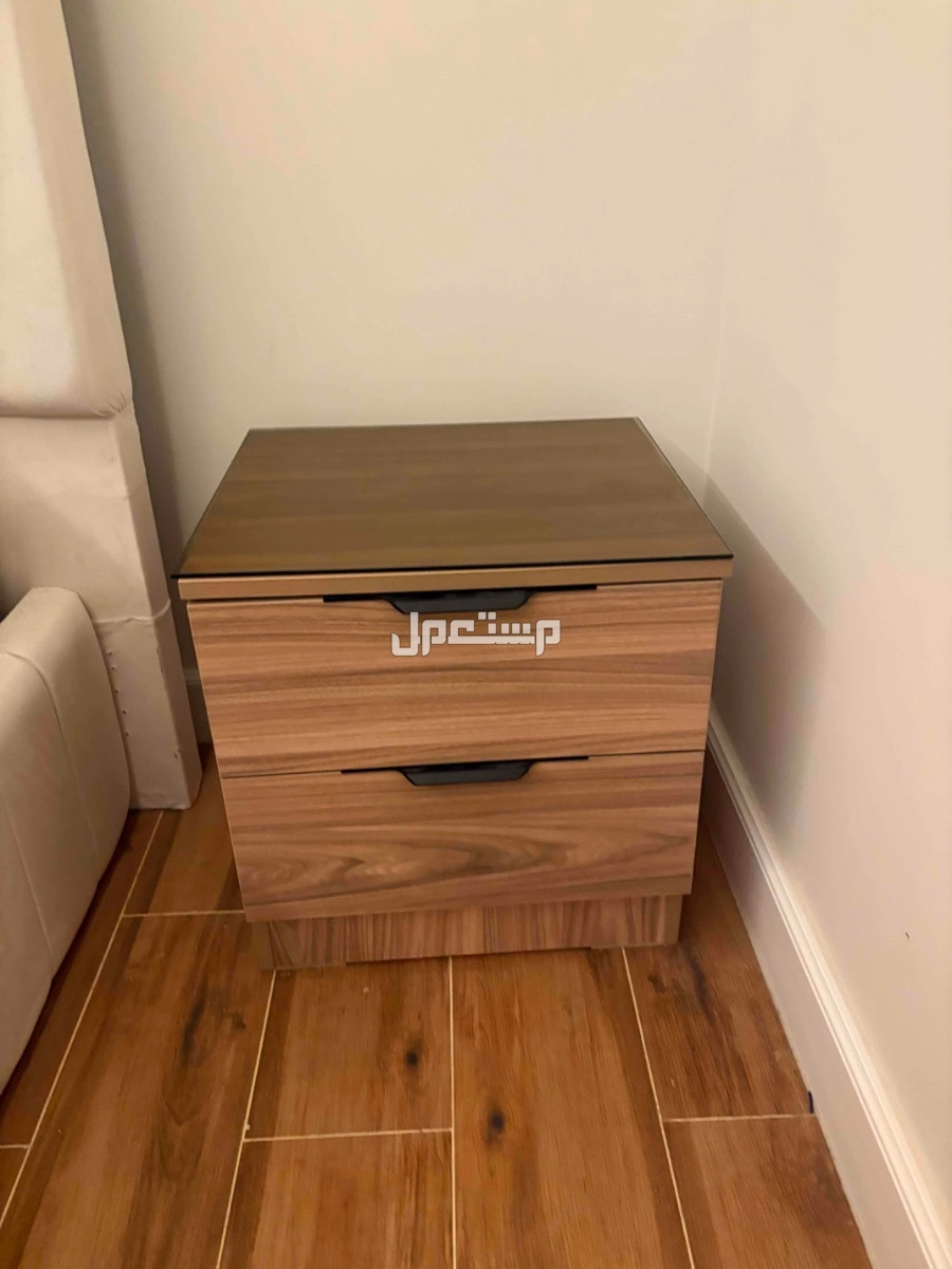 يوجد طاولتين بطابع عصري تحتوي على درجين 50 سم في 50 سم. خشبية بنيه و قزاز فوقها بني ايضا. تصلح جنب السرير على الجانبين.