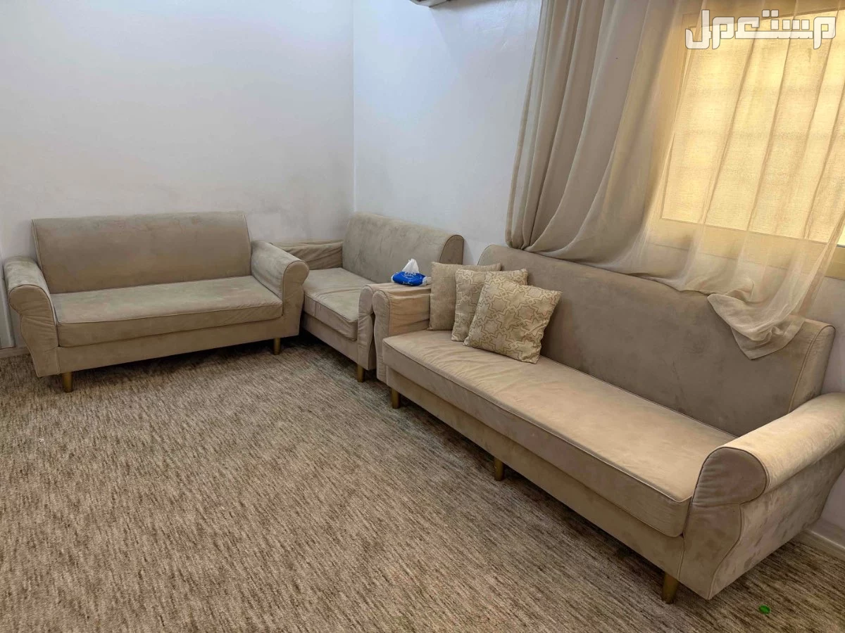 يوجد كنب ثلاث قطع ، واحد طول مترين والقطعتين الاخرى متر ونص حشوه قطن والقاعد السفليه حشوه خشب مع خداديات 8 حبات