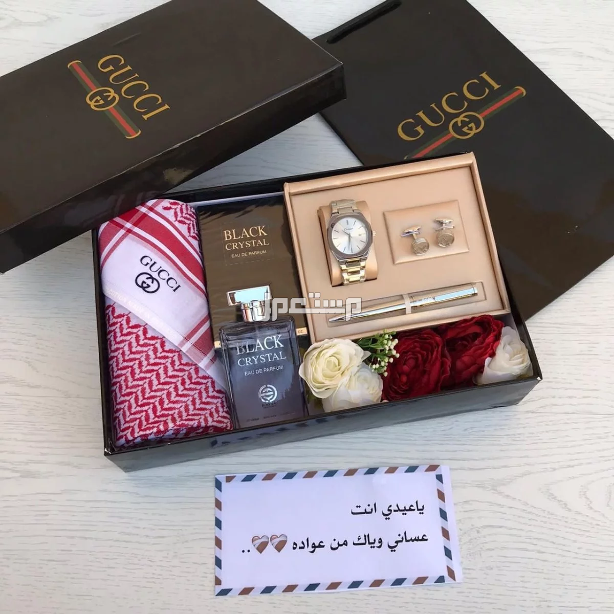 جديدنا بكس جوتشي🎁🛍️ مكون عطر 🎁طقم. ساعه شكلٍ جوتشي شماغ جوتشي مقاسات. 55'58'60 مع عباره من اختيارك💌 السعر 260 ريال