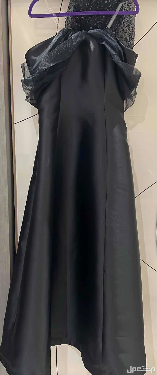 فستان سهره طويل باللون الاسود مقاس 3 قماش تفته واقف نص لمعه مع الحذاء مقاس 37 والشنطه وجميعها باللون الرصاصي