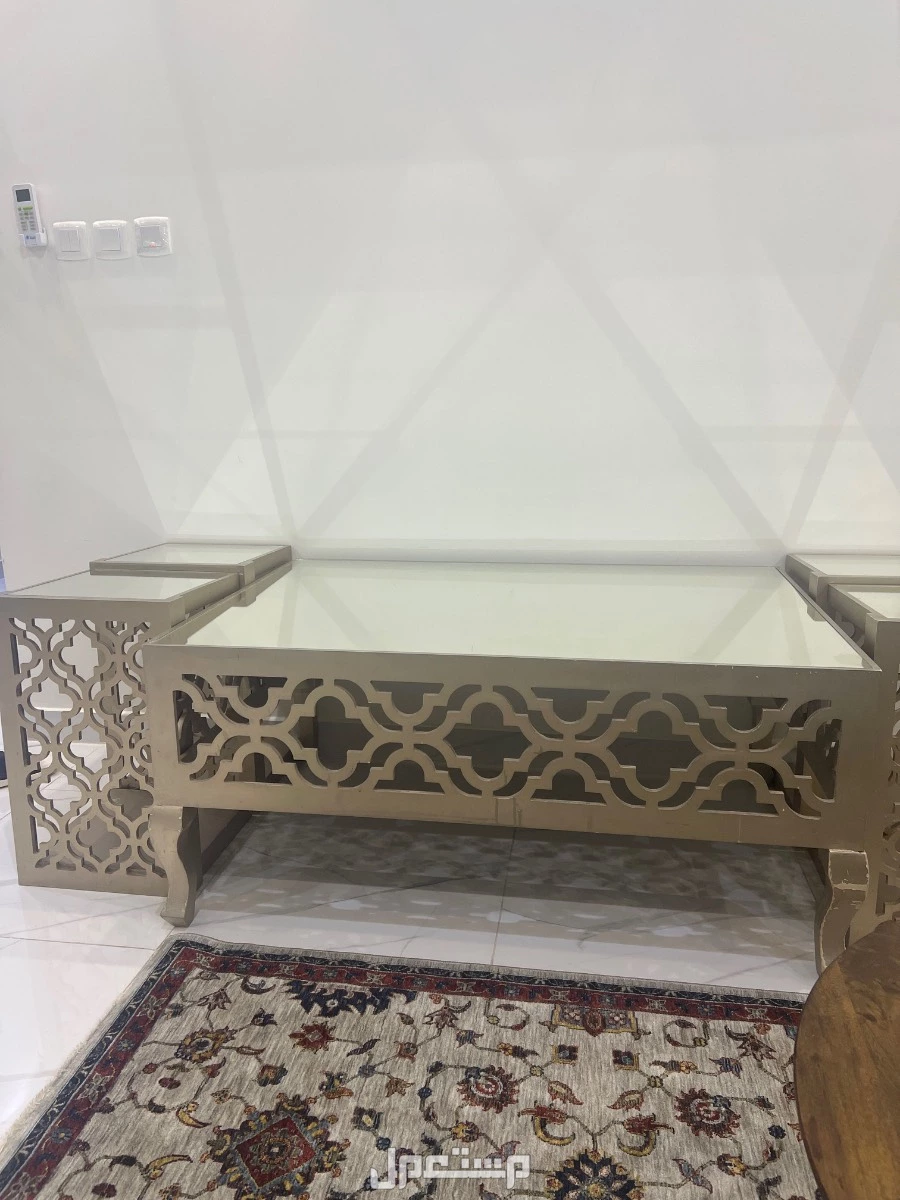 طاولات للبيع بحالة جيدة زجاج مع خدمتها اللون ذهبي فاتح مع اللون الذهبي على شكل مربع ذهبي فاتح و لون فاتح جدا