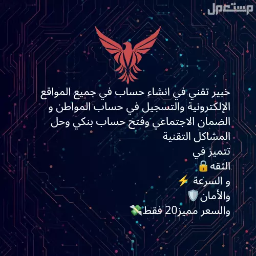 خبير تقني في: انشاء حساب في جميع المواقع الإلكترونية والتسجيل في حساب المواطن و الضمان الاجتماعي وفتح حساب بنكي وحل المشاكل التقنية نتميز في: الثقه🔒 و السرعه⚡ والأمان🛡️ والسعر مميز ورخيص 20 💸فقط