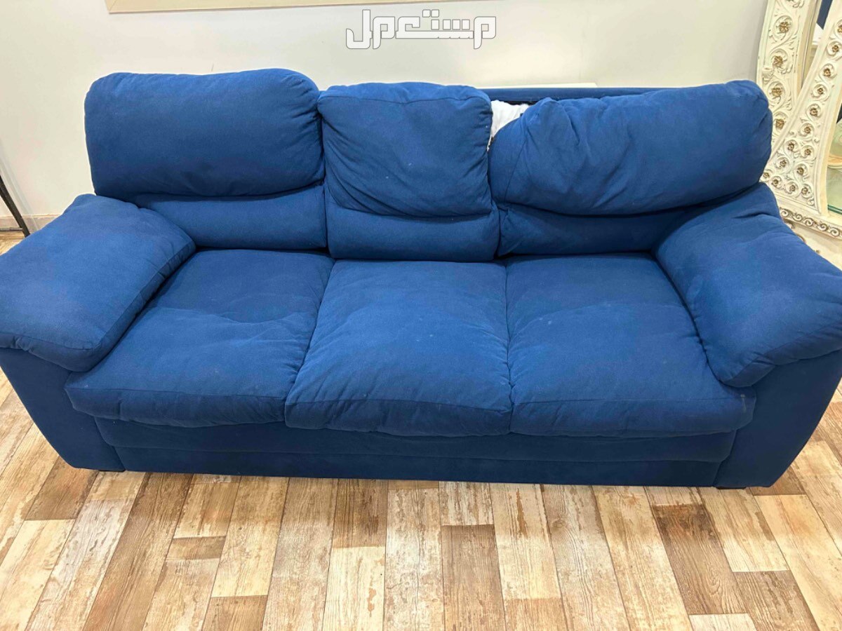 كنب كبير ثلاث مراتب مريح جداً اللون ازرق .موضح بالصور فيه قطع 1 بسيط ، يمكن اصلاحه او خياطته بالسعر 300