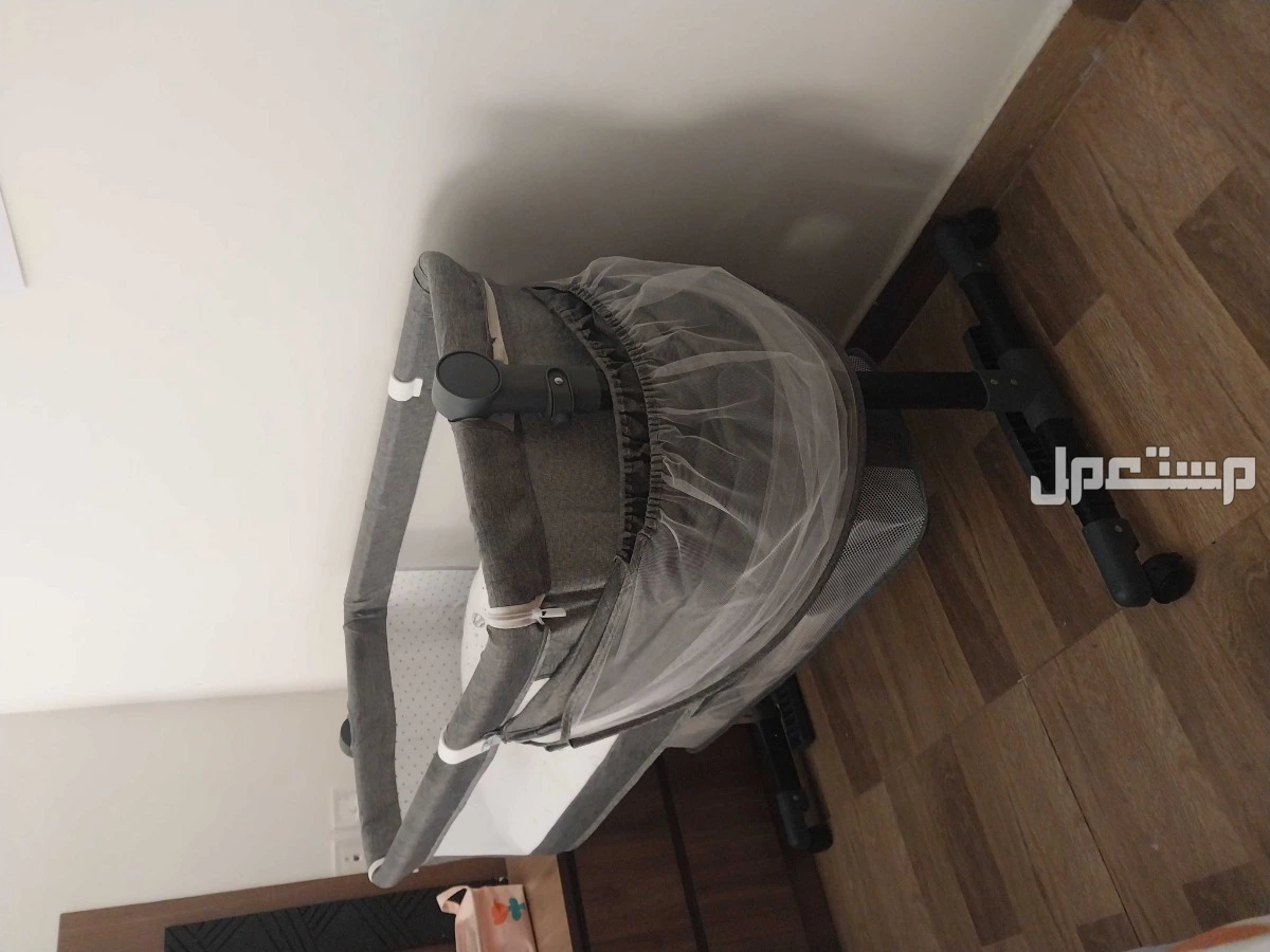 سرير أطفال بلون رمادي له أكثر من وضعية ويمكن فتح جانب على سرير الأم مناسب من عمر الولادة إلى خمس شهور ومرتبة حالتهم ممتازة