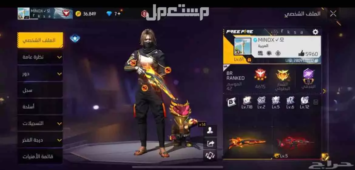 السلام عليكم ورحمة الله وبركاته اعرض لكم حساب فري فاير شاحن فيه حول2500 وفيه سلاحين مطوره سكار لفل 5 وايكي لفل4 عدد الشعر 179 والكمامات 116 والاوجوه 42 والفنايل 334 والسراويل214 والحذاين 186 (والسعر على السوم ) ولتفاصيل الحساب كامل واتس 0570039218