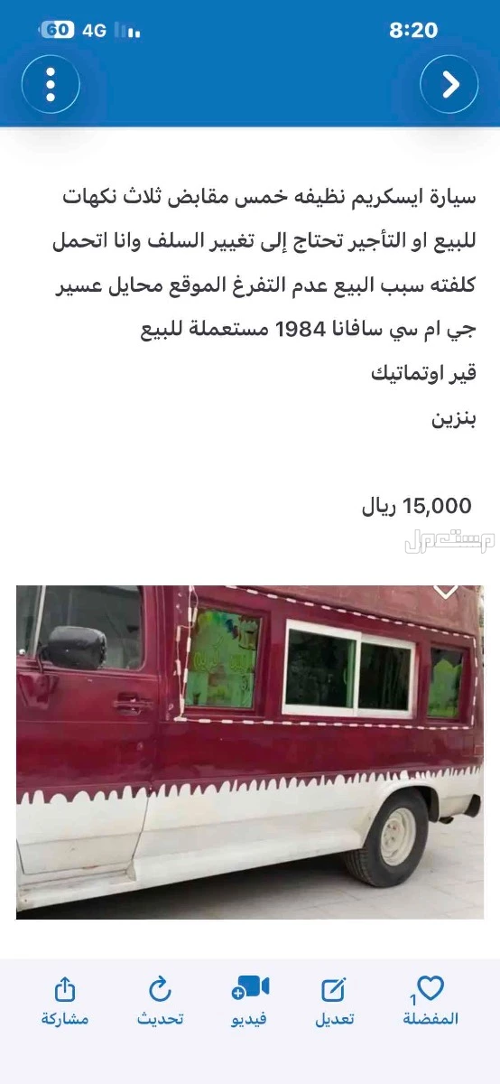 سيارة ايسكريم نظيفه خمس مقابض ثلاث نكهات للبيع او التأجير تحتاج إلى تغيير السلف وانا اتحمل كلفته سبب البيع عدم التفرغ الموقع محايل عسير جي ام سي سافانا 1984 مستعملة للبيع